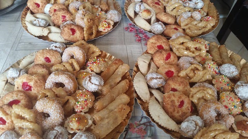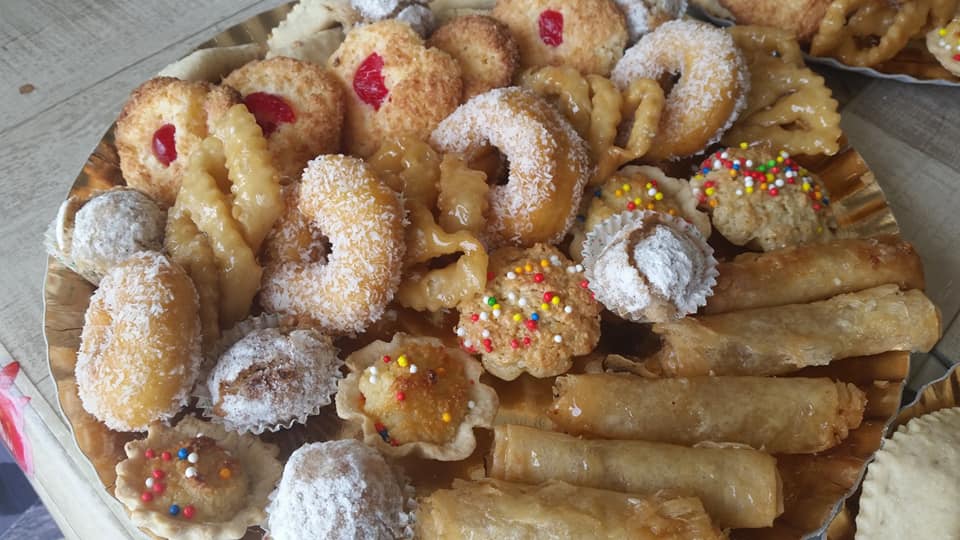 Plateau décoré de cigares, cornes de gazelles, massapans, yoyos, chebakiyas, dattes farcies, massapans aux noix enrobés de chocolat
