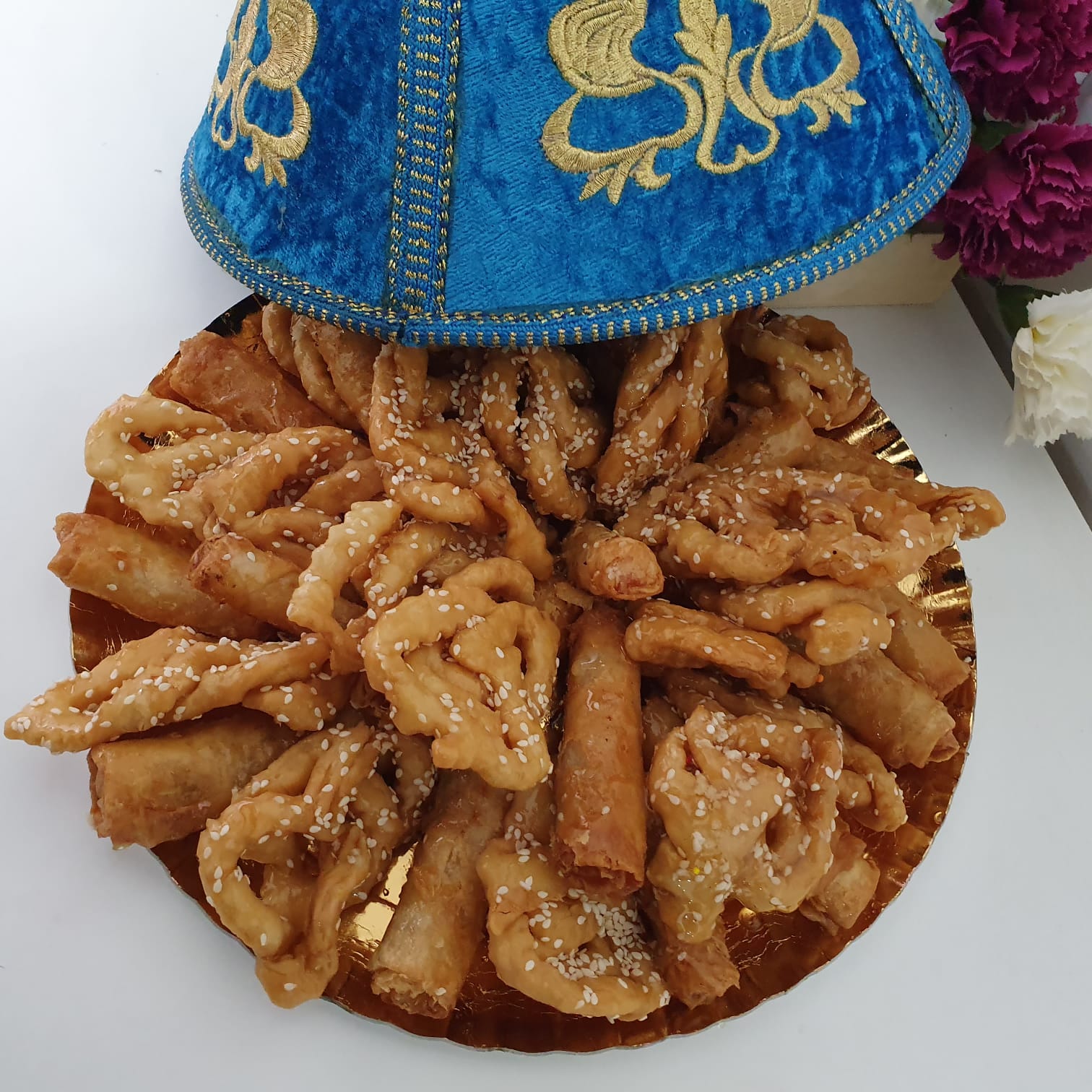 Plateaux de gâteaux orientaux authentiques : cigares aux amendes, chebakiyas et makrouds